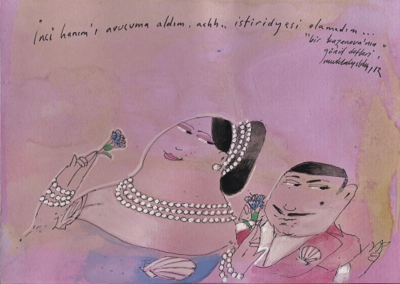 İnci Hanım' ı avcuma aldım, ahhh...istiridyesi olamadım. 17,5 x 24,5 cm. 2012 Kağıt üzerine karışık teknik.
