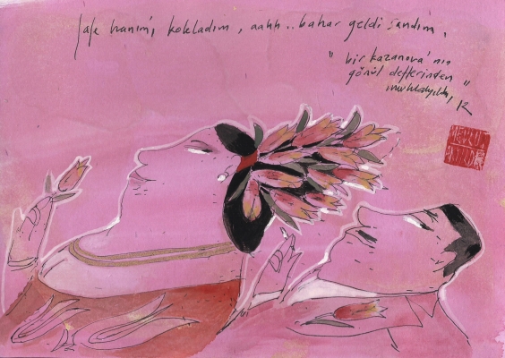 Lale Hanım' ı Kokladım, ahh...Bahar Geldi Sandım. Saadet Hanım'a 17,5 x 24,5 cm. 2012 Kağıt üzerine karışık teknik.