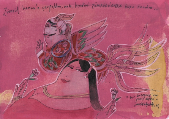 Zümrüt Hanım'a çarpıldım, ahhh...Kendimi Zümrüdüanka Kuşu sandım. 17,5 x 24,5 cm. 2012 Kağıt üzerine karışık teknik.
